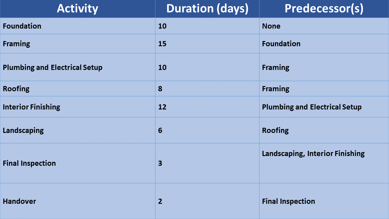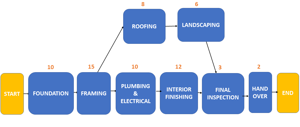 Imagine you are managing the construction of a residential house. Various activities must be completed, some of which can run in parallel, while others must follow a strict sequence.